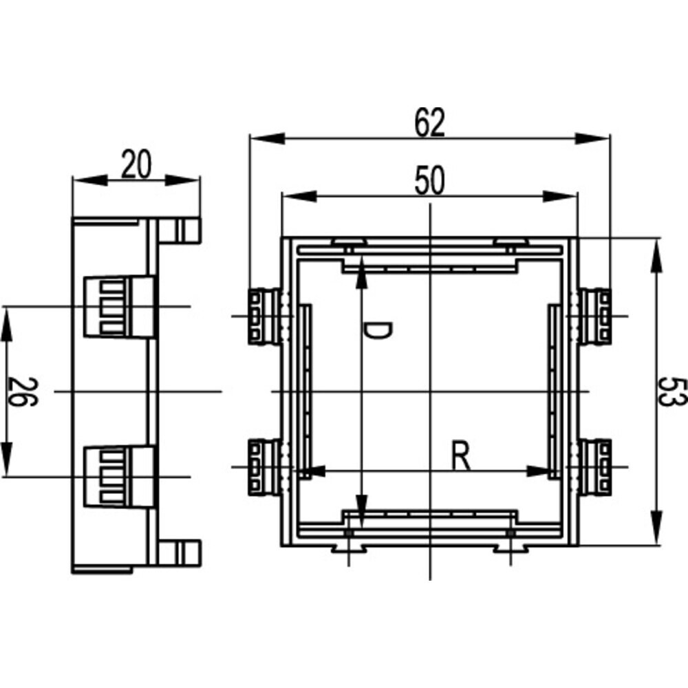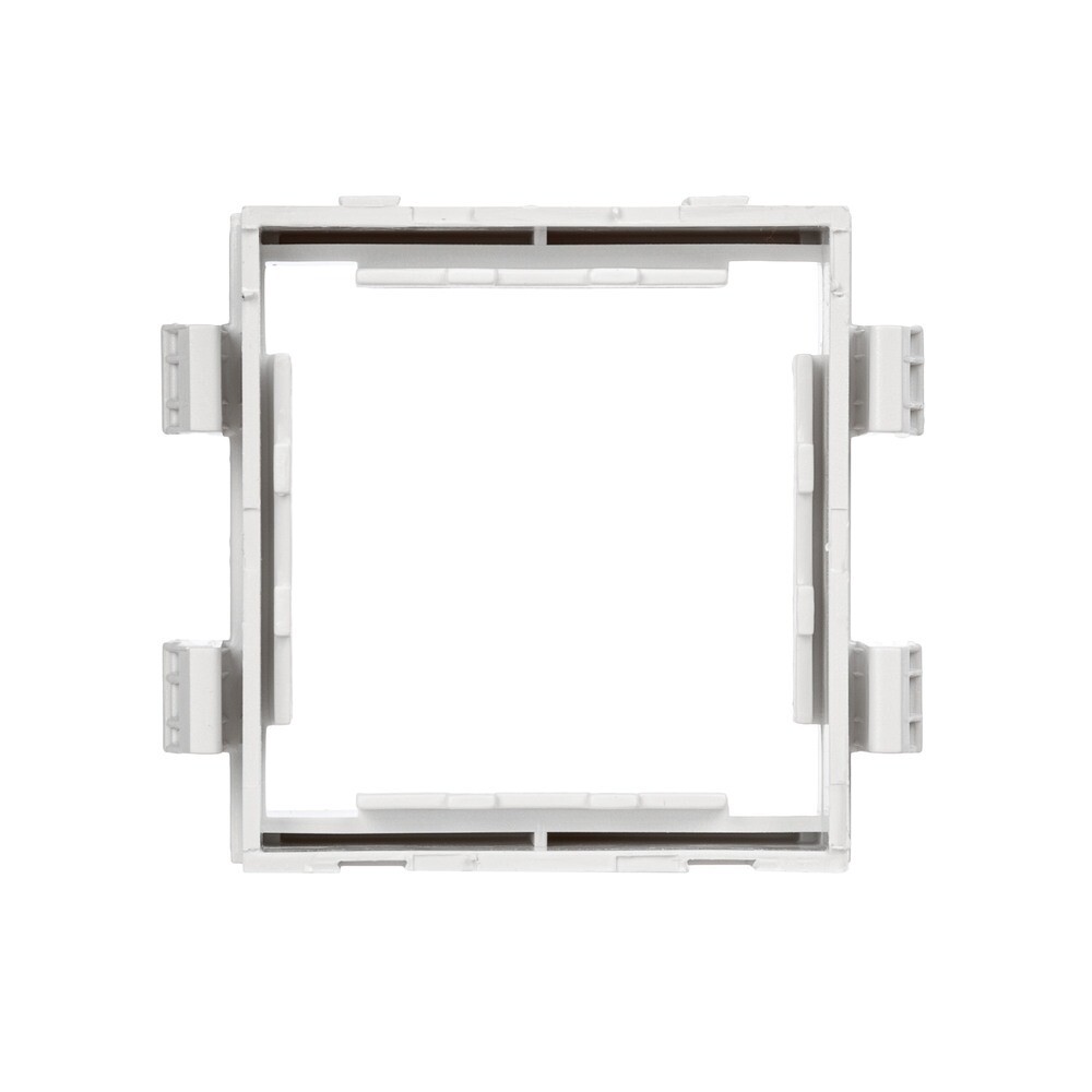 Каркас на 2 модуля для монтажа электроустановочных изделий «45х45». Назначение – монтаж электроустановочных изделий в пластиковые короба «In-liner Front», напольную башенку BUS, алюминиевые короба и колонны «In-liner Aero». Материал – АБС-пластик; с двух внешних сторон расположены замки, предназначенные для соединения одинаковых каркасов в ряд и для использования под одной сплошной рамкой. Каркасы для разных серий ЭУИ между собой не соединяются, но монтируются в ряд под одной рамкой.