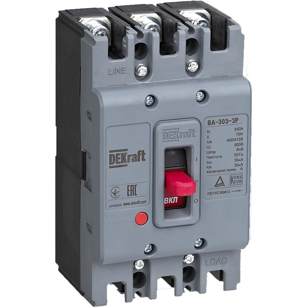 Автоматический выключатель в литом корпусе Dekraft ВА-303 3P 200А тип D 36 кА 415 В (22754DEK)