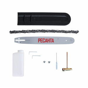 Комплектация: Бензопила — 1 шт.; Шина — 1 шт.; Цепь — 1 шт.; Защитный кожух шины — 1 шт.; Емкость для смешивания топливной смеси — 1 шт.; Паспорт продукции — 1 шт.; Комплект инструментов и принадлежностей — 1 шт.