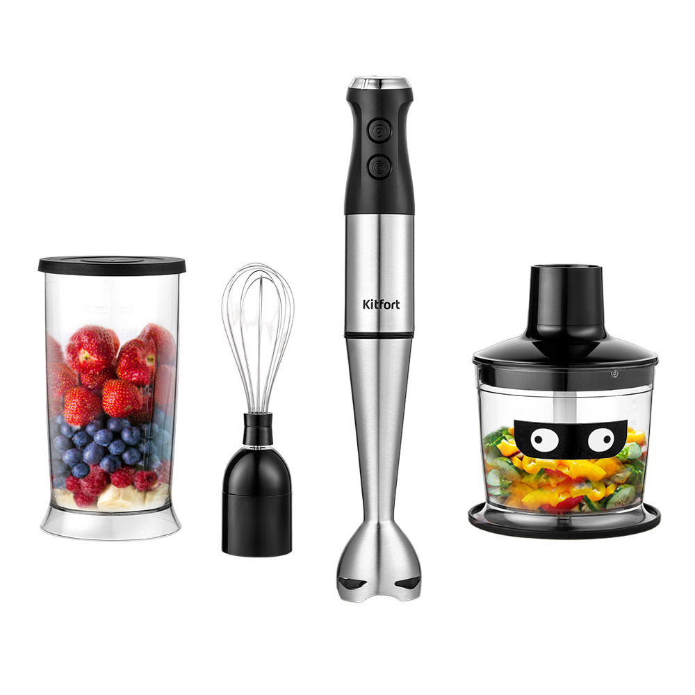 Погружной блендер КТ-3503 — универсальное кухонное устройство, с которым можно приготовить множество блюд. Устройство предназначено для смешивания, взбивания, приготовления фитнес-напитков, соусов, детского питания, молочных коктейлей и многого другого. Прибор Kitfort КТ-3503 может выполнять функции измельчителя, погружного блендера, а также в комплекте есть венчик для взбивания. На верхней части моторного блока находится регулятор скорости — с его помощью сможете плавно изменять скорость работы от низкой к высокой. На моторном блоке устройства расположены 2 кнопки — кнопка включения и турборежим. Насадки легко снимаются с блендера, поэтому уход за устройством не составит труда. Чаша измельчителя и стакан сделаны из безопасного пищевого пластика. Благодаря резиновой подкладке измельчитель меньше скользит по столу. Нож насадки-блендера, венчик и лезвия ножа чаши измельчителя выполнены из нержавеющей стали, что обеспечивает их долгий срок службы.