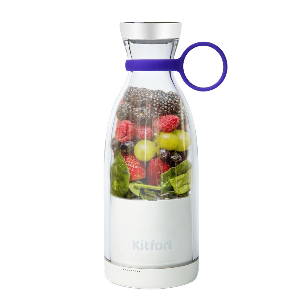 Портативный блендер Kitfort КТ-3506 — оптимальное устройство для любителей коктейлей и смузи. Это незаменимый помощник в приготовлении фитнес-напитков, детского питания, супов — пюре, а также протеиновых и детокс-коктейлей. Прорезиненная ручка на бутылке позволяет удобно переносить блендер не боясь, что он выскользнет из рук. А благодаря компактному размеру, устройство можно брать с собой на работу, в спортивный зал, в машину, на пикник или прогулку. Крышка на горлышке позволяет добавлять ингредиенты, не снимая бутылку с моторного блока. Для более эффективной работы блендера перед смешиванием все ингредиенты нужно порезать на кусочки, а твердые ингредиенты смешать с небольшим количеством жидкости. Лезвия выполнены из нержавеющей стали и отличаются своей мощностью, благодаря чему рубят продукты на высокой скорости вращения до 20 000 оборотов в минуту, превращая продукты в пюре. Устройство запускается двойным нажатием на кнопку включения. Портативный блендер работает от аккумулятора и заряжается от базы со шнуром USB. Установите базу, чтобы контакты на моторном блоке и базе совпали. Когда аккумулятор заряжается, индикатор горит белым светом. Обычное время зарядки — 4 часа. Блендер легко разбирается и позволяет тщательно промывать его детали. Дополнительная крышка на дно позволяет снять моторный блок и накрутить крышку, превращая бутылку блендера в обычную бутылку для переноски напитков.
