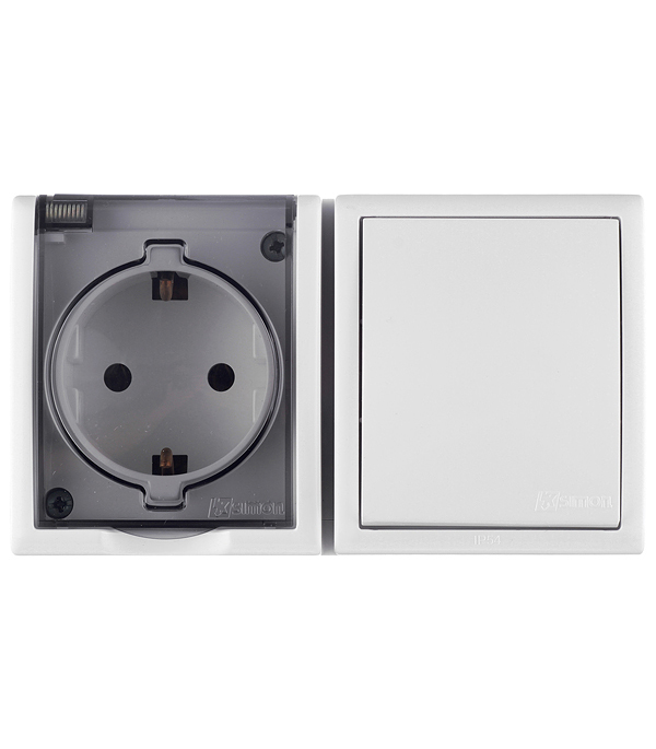 Блок выключатель и розетка Simon 15 Aqua одноклавишный накладной белый (1594511-030)