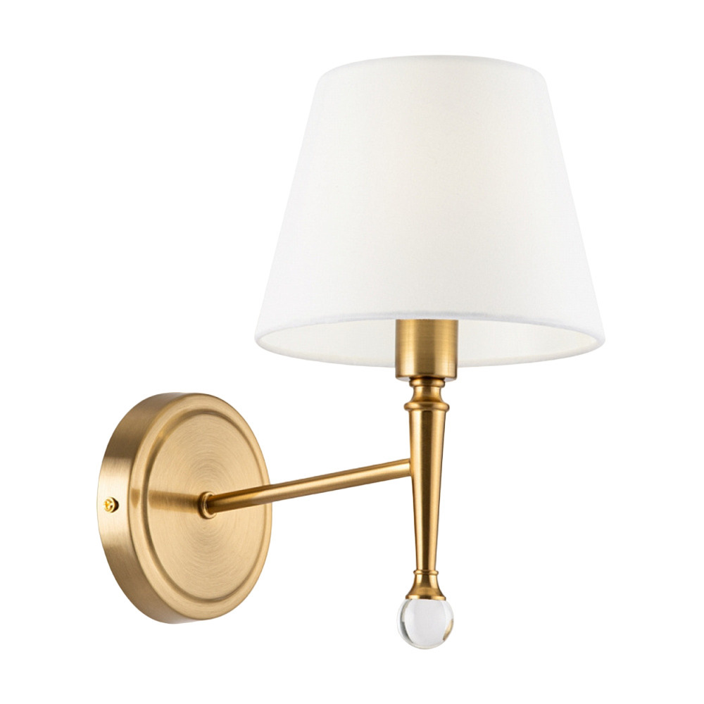 Сдержанный и визуально легкий силуэт металлической арматуры подчеркивается благородным оттенком латуни и никеля. Традиционную для классического стиля симметрию разбавляют декоративные капли из прозрачного хрусталя. Преломляя лучи света, они дарят радужные блики и освежают композицию. Абажуры из красивой текстурированной ткани завершают лаконичный и изящный образ. Они представлены в двух оттенках — белом и черном. Лампы в комплект не входят.