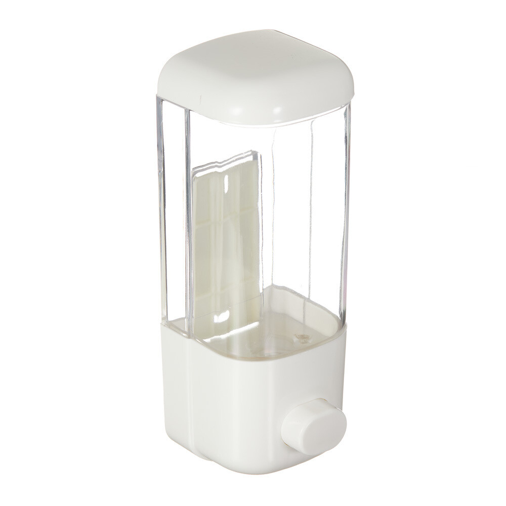 Диспенсер подходит для жидкого мыла, шампуня, моющего средства и бальзама. Осуществляет подачу моющего средства с помощью нажатия на кнопку, расположенную на корпусе. Объем 500 мл. Изготовлен из ударопрочного пластика.