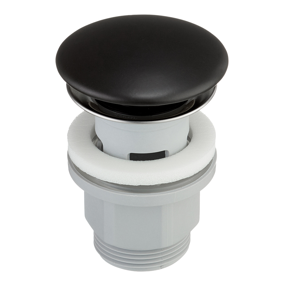 С отверстием для подключения перелива, позволяющего выпускать воду из раковины при ее переполнении через отверстие в нижней части перелива. Система клик-клак — управляется нажатием на пробку слива. Покрытие устойчиво к коррозии, появлению царапин, сколов и потускнению. Круглая заглушка черного матового цвета.