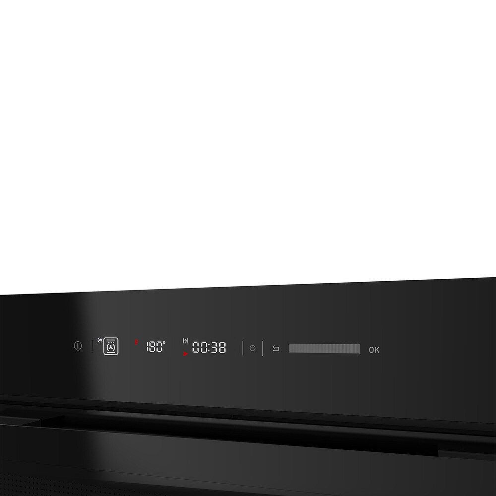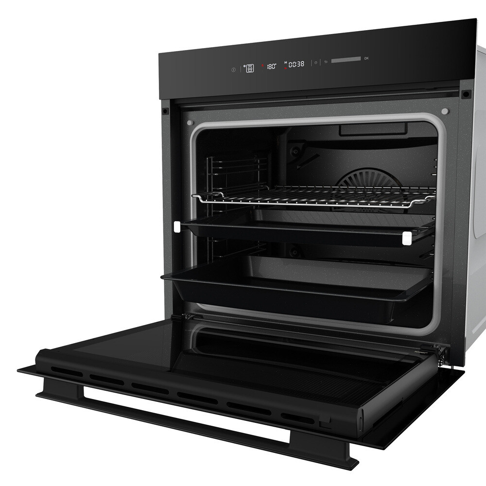 Электрический духовой шкаф Infinitum max 60 выполнен в современном дизайне Total Black из черного закаленного стекла с полностью сенсорным управлением Touch Control. Модель встраивается в шкаф шириной 60 см и имеет полезный объем Extra Large — 78 литров, благодаря которому вы без проблем сможете готовить большое количество порций на нескольких уровнях. В базовую комплектацию входит все необходимое для приготовления: стандартный и глубокий противни, решетка для гриля. Дверца духового шкафа выполнена из закаленного стекла Schott Ceran и имеет усиленную теплоизоляцию LOW-E. Infinitum max 60 оснащен 9 режимами работы — грилем, 3D-конвекцией, функцией разморозки, удобным электронным таймером с функциями напоминания/включения/отключения. Для вашего удобства в духовом шкафу предусмотрены доводчик плавного закрытия дверцы, а также телескопические направляющие на одном уровне, которые обеспечат легкий доступ к блюду во время приготовления.