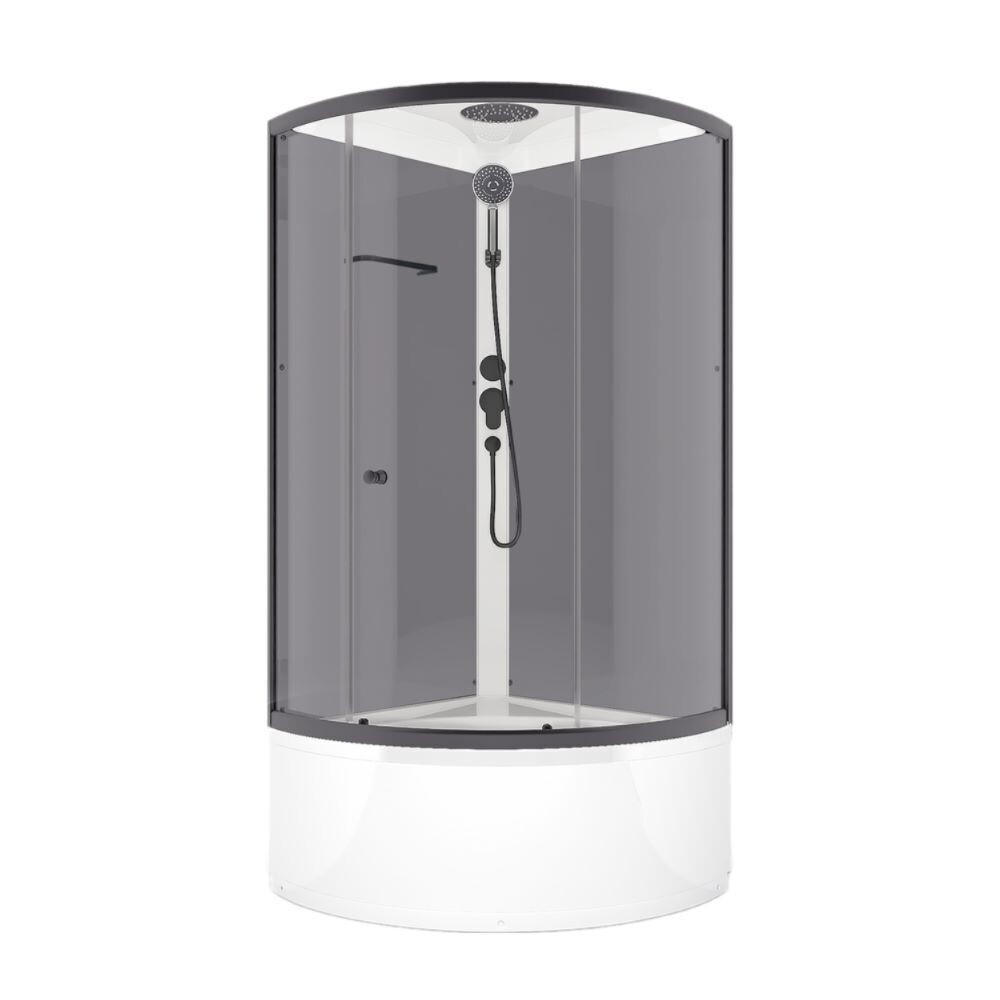 Душевая кабина с высоким поддоном, серыми стенками и прозрачным стеклом. Кабина закрытого типа с крышей. Данная модель сочетает в себе высокие эксплуатационные характеристики, стильный дизайн и доступную цену. С целью достижения увеличенной жесткости конструкции горизонтальный профиль ложится на бортик поддона (а не рядом с бортиком) и не имеет движения по поддону, а отсутствие зазора между профилем и бортиком поддона препятствует скоплению грязи. Установка такой душевой кабины не займет много времени и сил.
