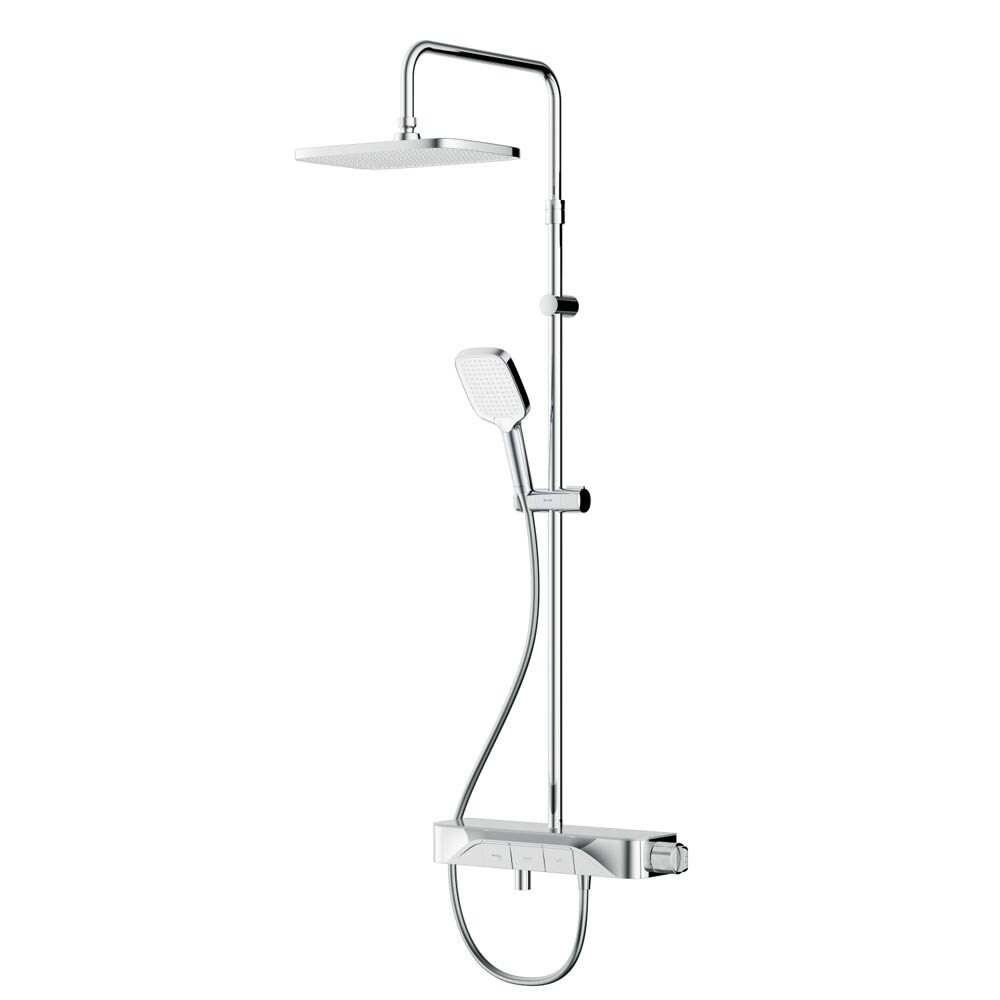 Смеситель выполнен в виде вместительной полочки. Внушительный размер полки (40 см) позволяет хранить все любимые средства под рукой, а эстетичный силуэт станет настоящим украшением современной ванной комнаты. Всего одна удобная ручка для настройки температуры и потока воды. Ручка дополнена инновационным антискользящим покрытием, которое позволяет комфортно управлять душевой системой даже с мыльными руками. Переключение потоков воды осуществляется нажатием клавиши. Телескопическая штанга регулируется по высоте, обеспечивая комфорт для людей любого роста. Трендовая прямоугольная форма, увеличенный размер леек и 3 режима ручного душа подарят ощущения настоящего домашнего SPA.