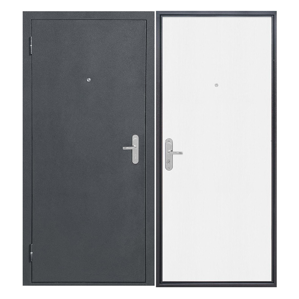 С внешней стороны дверного полотна стальной лист 0,8 мм с атмосферостойким порошковым покрытием цвета «Антик Серебро», с внутренней стороны дверное полотно выполнено из ЛДВП-панели в цвете «Беленый дуб»; наполнение пенополистиролом.