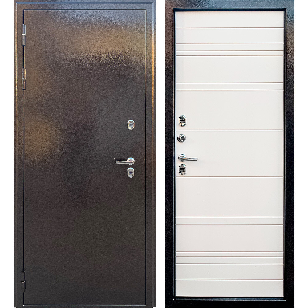 Предназначена для установки в качестве уличной входной двери в частных домах, загородных коттеджах, таунхаусах, на границе улица/дом, в том числе в жилых и общественных зданиях. Полотно изготовлено из стали. С внутренней стороны облицовано фрезерованной МДФ-панелью толщиной 10 мм. Стальной лист 1,2 мм с атмосферостойким порошковым покрытием цвета «антик медный»; панель МДФ, толщиной 10 мм в цвете «белый»; наполнение — базальтовая плита + пенополистирол.