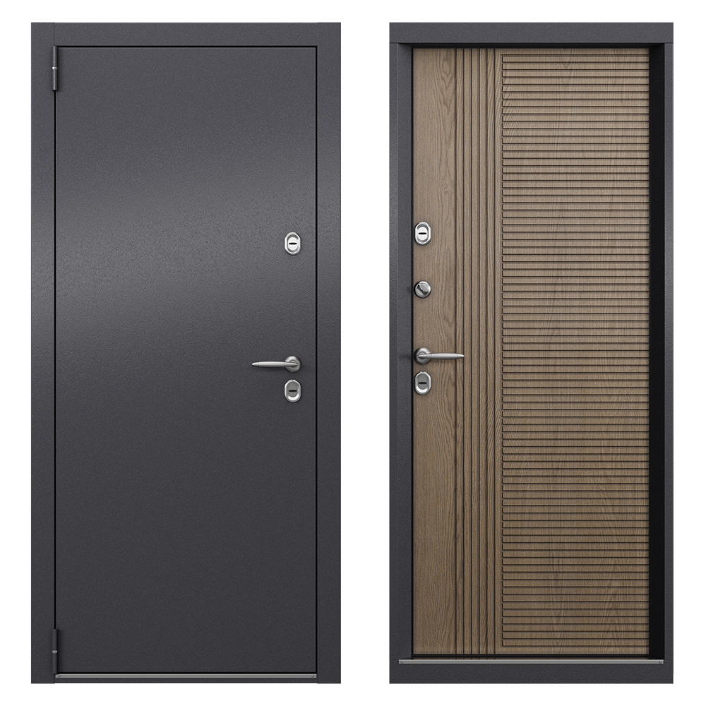 Наполнение полотна — пенополистирол + минеральная плита в ребрах жесткости с терморазрывом — фольгированный пенофол по периметру. Предназначена для установки в качестве уличной входной двери в частных домах, загородных коттеджах, таунхаусах, на границе улица/дом, в том числе в жилых и общественных зданиях. Для дверей, имеющих контакт с улицей, обязательно наличие козырька, защищающего от прямых воздействий осадков и солнечного света. Полотно изготовлено из стали, усиленное вертикальными ребрами жесткости. Стальной лист с атмосферостойким порошковым покрытием цвета «Темно-серый букле графит»; панель МДФ в цвете «Астана табачный». Короб — цельногнутый профиль закрытого типа с терморазрывом МДФ 6 мм.