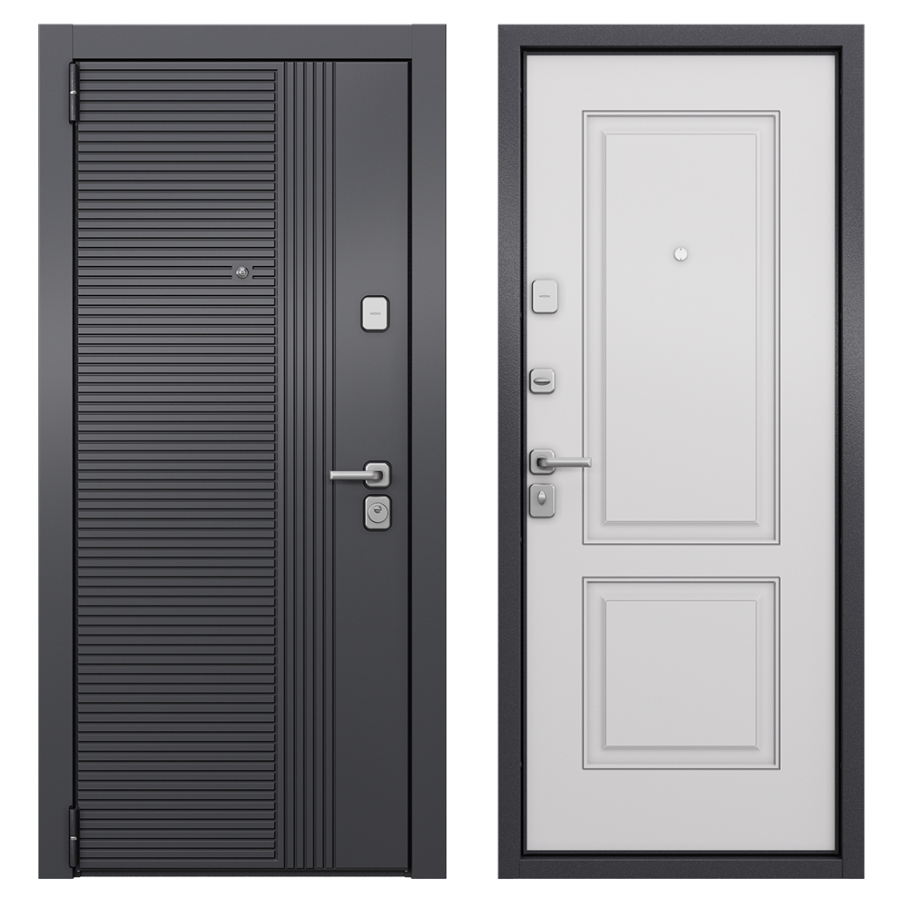 Наполнение — минеральная плита высокой плотности + пенополистирол. Предназначена для установки в жилых и общественных зданиях в качестве входной двери внутри помещения. Полотно изготовлено из стали. Стальной лист 1,4 мм с атмосферостойким порошковым покрытием цвета «Темно-серый букле графит»; с внешней отделкой МДФ в цвете «Оскуро» с декоративной отделкой; с внутренней стороны МДФ в цвете «Бьянко».