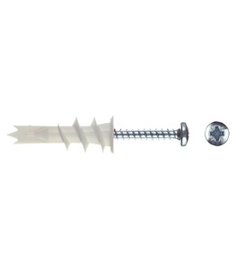 Представляет собой втулку с широкой резьбой на внешней поверхности по всей длине дюбеля. Заостренный наконечник предназначен для быстрой установки в гипсокартон без предварительного засверливания отверстия. Внутренняя конструкция анкера предназначена для использования универсального самореза и имеет крестообразный шлиц для установки.