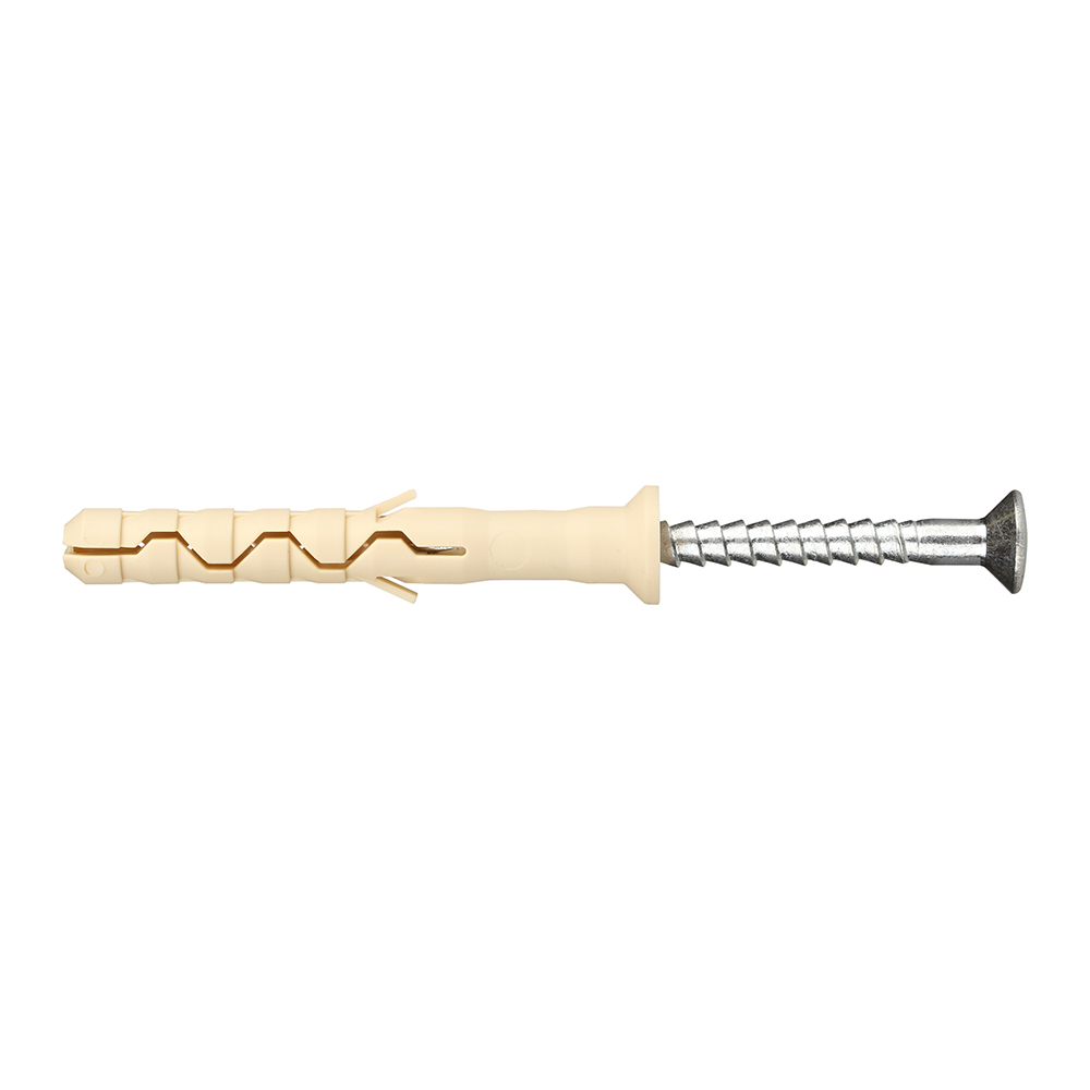 Нейлон обеспечивает надежное сцепление с материалом основания. Резьбовой оцинкованный гвоздь повышенной прочности заранее установлен в дюбель.