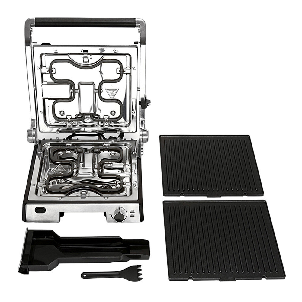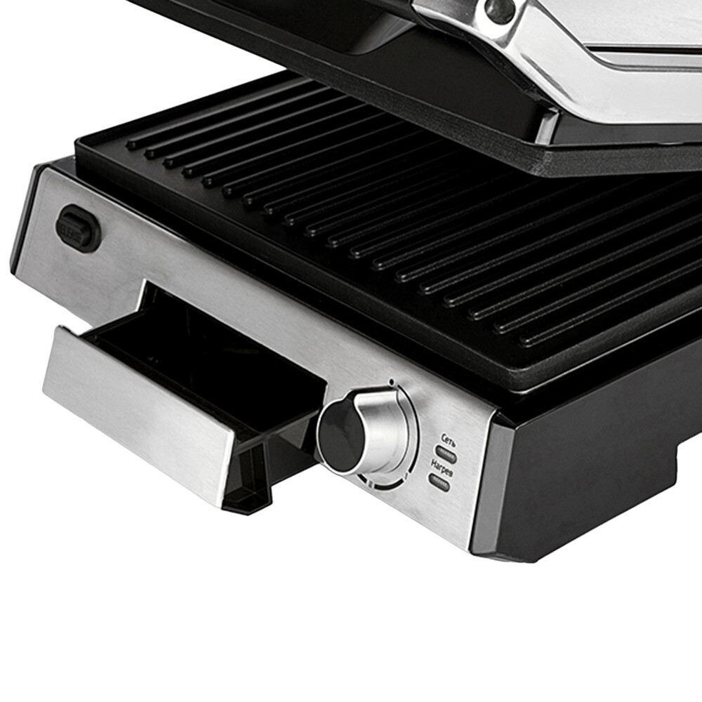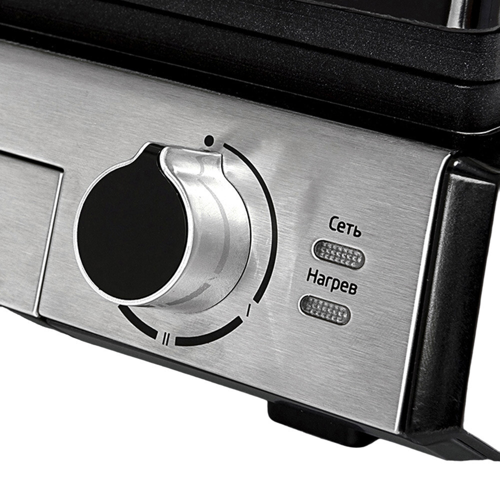 Гриль оснащен термостатом с плавной регулировкой, позволяющим выставить температуру вплоть до 230 °С