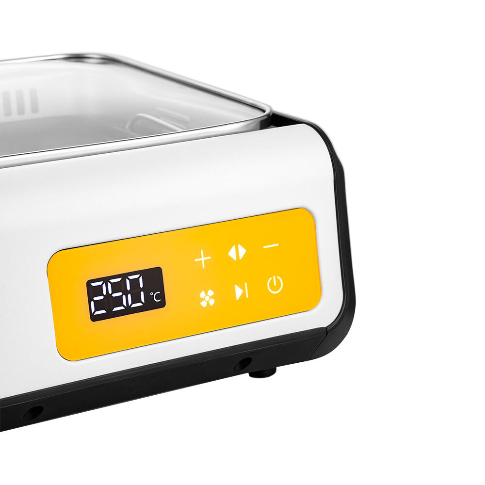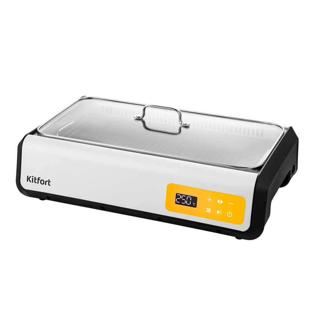 Электрогриль КТ-1686 предназначен для приготовления мяса, рыбы, овощей, сосисок, бутербродов, панини, сэндвичей, гренок, тостов и многих других блюд. На дисплее отображаются температура приготовления и таймер. С помощью сенсорных кнопок вы самостоятельно можете запускать и отключать вентилятор, а также настроить температуру (100, 120, 140, 160, 180, 200, 220, 250°C) и таймер от 20 до 120 минут. Большая площадь поверхности съемных панелей позволяет одновременно жарить много продуктов. У прибора две панели для жарки: с гладкой и ребристой поверхностью. Панель с ребристой поверхностью придает ребристый рисунок и помогает стекать жиру. Вентилятор позволяет удалять из гриля образующийся в процессе готовки дым, что улучшает качество приготовления и препятствует запотеванию крышки.