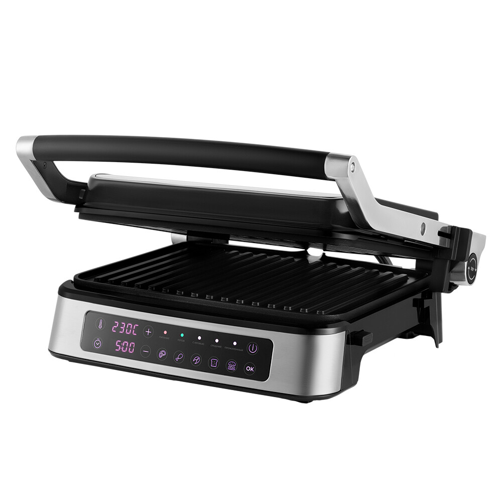 Электрогриль КТ-1687 предназначен для приготовления разнообразных блюд, включая мясо, рыбу, овощи, сосиски, сэндвичи, гренки и тосты. С помощью панели управления вы можете выбрать автоматический режим работы: мясо, рыба, курица, сосиски, гамбургер и бекон. Вы также можете вручную установить температуру нагрева до 230°C. Кроме того, прибор обладает настройкой степени прожарки. С помощью КТ-1687 вы можете готовить как в двухстороннем, так и в одностороннем режиме. В одностороннем режиме крышка гриля откидывается на 180°, и гриль превращается в большую жаровню. Для приготовления можно использовать обе поверхности. Съемные гнаревательные панели изготовлены из алюминия с нанесенным антипригарным покрытием. Весь лишний жир и сок из блюд попадает в съемный поддон.