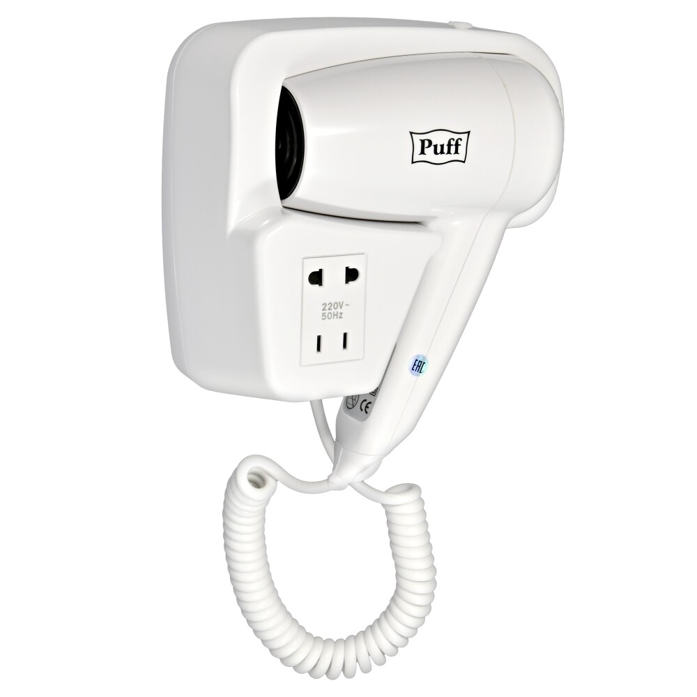 Настенный фен Puff-1200В предназначен для быстрой сушки и комфортной укладки в спорткомплексах, фитнес-центрах, бассейнах, отелях, гостиницах, частных домах и квартирах. Это одна из наиболее доступных моделей, оснащенная дополнительной электророзеткой на корпусе — что делает ее особенно удобной для семейных номеров. Кроме того, фен имеет удобное крепление для установки.