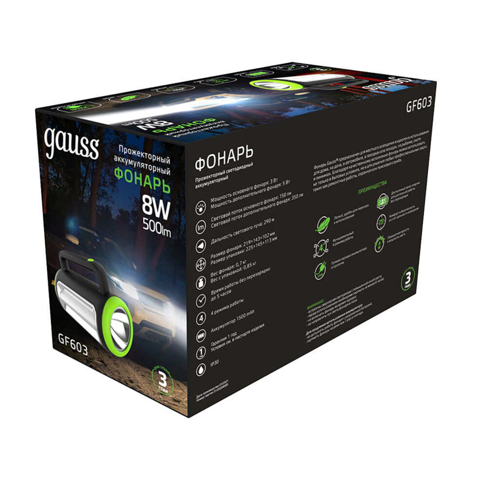 Фонарь ручной Gauss светодиодный 37 LED 8 Вт аккумуляторный Lead-acid 1500 мАч пластик 4 режима (GF603)