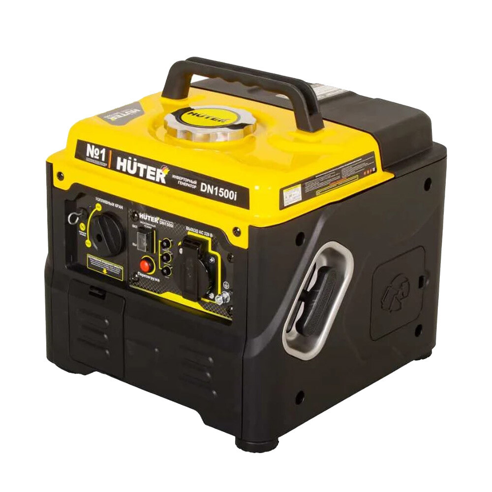 В модели Huter DN1500i четырехтактный двигатель с воздушным охлаждением и защитой от перегрузки, который вырабатывает мощность 1,1-1,2 кВт. Стартер ручной. Автоматическая регулировка оборотов позволяет экономить топливо при неполной нагрузке. Топливный бак рассчитан на 3,5 л неэтилированного бензина высокой очистки с октановым числом не меньше 92.