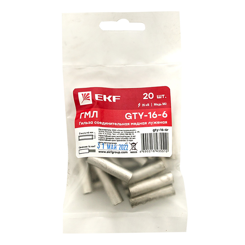 Гильза кабельная медная луженая EKF PROxima ГМЛ d6 мм 16 кв.мм (20 шт.)
