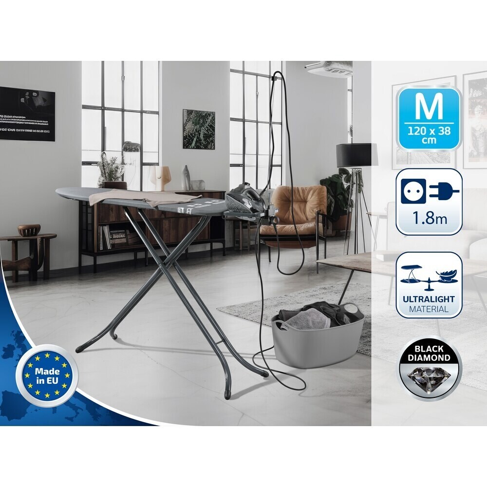 Гладильная доска Air Board M Black Plus имеет фиксированную подставку для утюга с держателем кабеля и розеткой. Она оснащена регулировкой по высоте: до 98 см. Доска имеет транспортировочный замок для удобной транспортировки и компактного хранения. Благодаря отражающей поверхности белье гладится сразу с двух сторон.