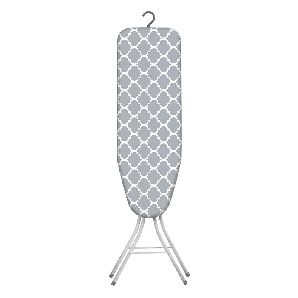 Гладильная доска с рабочей поверхностью из ДСП и чехлом из 100% хлопка. Надежная фиксация опор в разложенном положении, пластиковые наконечники на опорах защищают напольное покрытие. Доска легко складывается и имеет складной крючок для хранения в подвешенном состоянии. Максимальная нагрузка на гладильную поверхность 10 кг. Компактное хранение в сложенном виде.