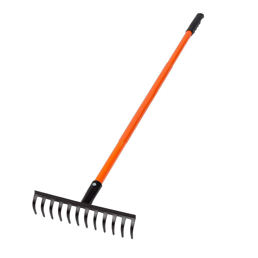 Прямые грабли 12 зубцов – незаменимый инвентарь на садовом участке для очистки территории от скошенной травы, опавших листьев и другого мусора. Также применяются для выравнивания и рыхления почвы на грядах и клумбах.