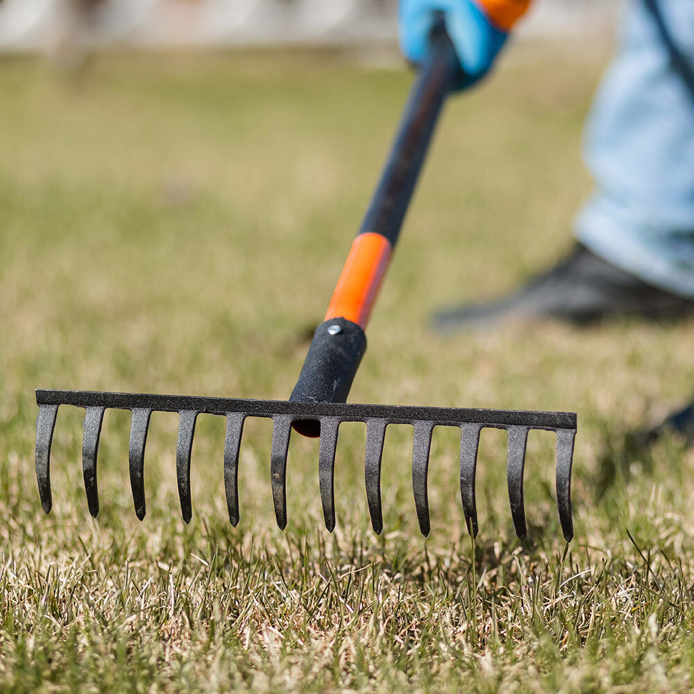 Прямые зубья отлично удерживают сухой мусор, что увеличивает скорость работы. Металлический черенок надежно зафиксирован и обеспечивает комфортную работу.