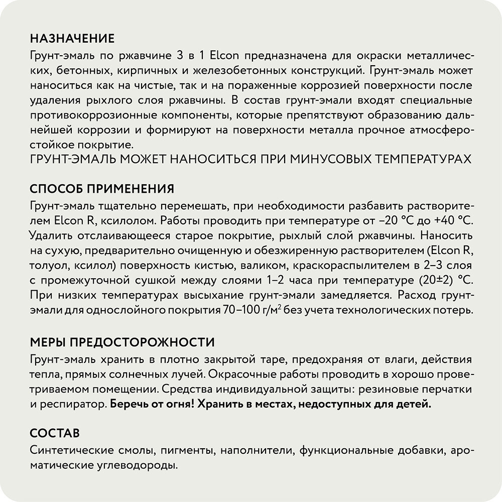 Грунт-эмаль 3 в 1 Elcon предназначена для нанесения как на чистые, так и на пораженные коррозией металлические поверхности с целью созд…