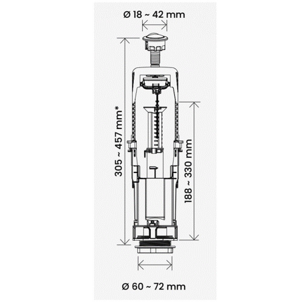 Однорежимный спускной клапан с телескопической трубкой перелива, которая регулируется без подрезки. Хромированная кнопка устойчива к истиранию, выполнена из прочного АБС-пластика, покрытие кнопки выполнено методом гальванизации. Комфортное усилие срабатывания (ниже 20 Н). Подходит для бачков различной высоты (от 305 до 457 мм) под диаметр в крышке бачка от 18 до 42 мм. Прокладка между бачком и унитазом выполнена из пенорезины, хорошо компенсирует неровности полки унитаза. Подходит для установки в бачки брендов Cersanit, Roca, Vitra, YD и др. Продукция изготовлена в соответствии с ГОСТ 21485-2016.