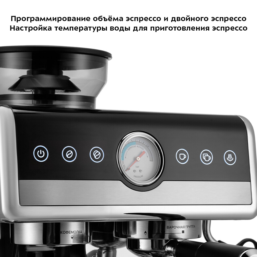 Кофейная станция КТ-7413 сочетает в себе два устройства в одном корпусе. Встроенная кофемолка с коническими металлическими жерновами позволяет измельчать кофейные зерна непосредственно перед приготовлением кофе. С помощью стимера вы можете приготовить молочную пенку, а также подогреть паром остывший чай или молоко. Металлический фильтр с лазерным нанесением отверстий долговечен и не требует использования каких-либо расходующихся частей. Кофейная станция оснащена съемным резервуаром для воды и металлическим рожком.