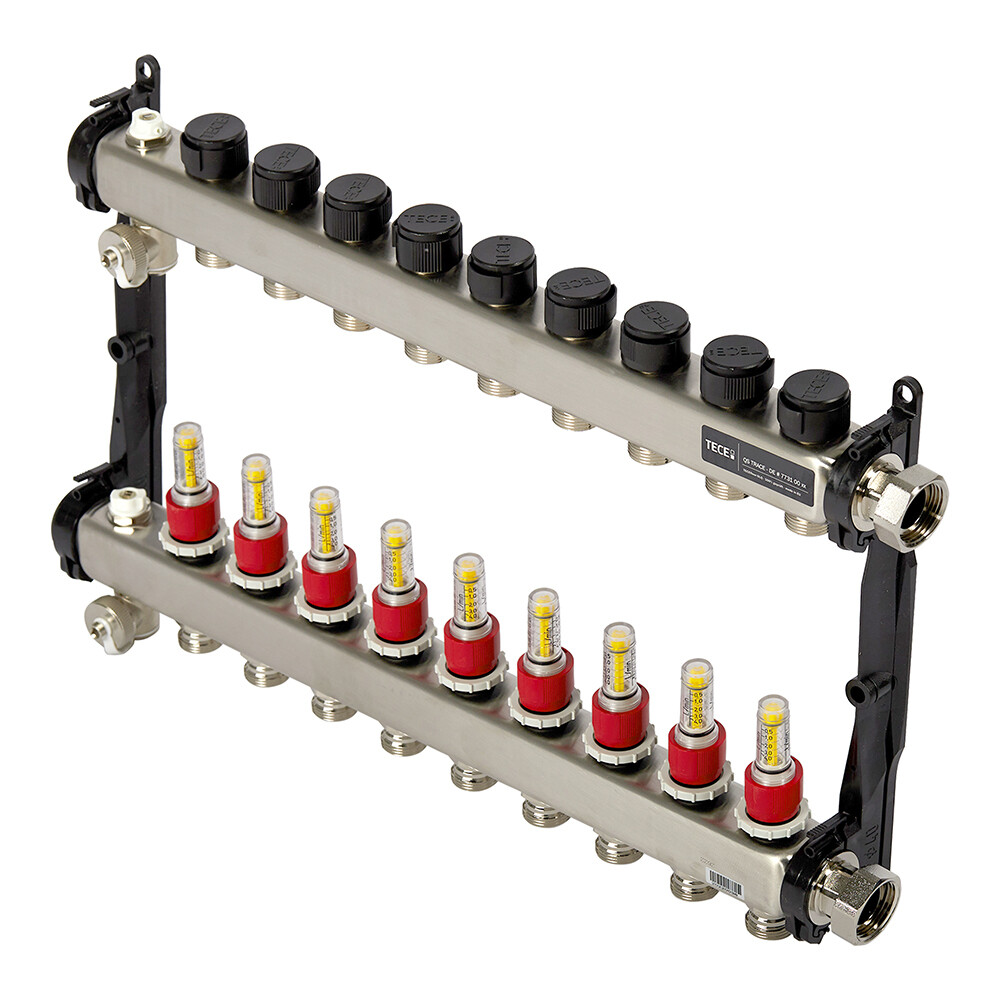 Коллектор для теплого пола Tece 1 ВР(г) х 9 выходов 3/4 НР(ш) ЕК х 1 ВР(г) с расходомерами (77310009)