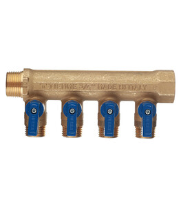 Коллектор Tiemme 3/4 ВР(г) х 4 выхода 1/2 НР(ш) ЕК х 3/4 НР(ш) с шаровыми кранами (1820039/1820016)