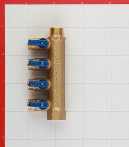 Предназначен для равномерного распределения и поступления воды от главного трубопровода по металлопластиковым трубам к сантехнике и другим потребителям без потери напора воды. Позволяет изолировать часть системы в случае неисправностей и проводить ремонт, не производя при этом общего отключения водоснабжения. Используется для разделения потока воды из одной трубы на четыре линии. Имеет с одного входа внутреннюю резьбу 3/4″ (20 мм) с другого входа наружную резьбу 3/4″ (20 мм), что позволяет соединять коллекторы между собой, увеличивая количество отводимых линий. Ручки синего цвета. Межосевое расстояние между отводами 36 мм.