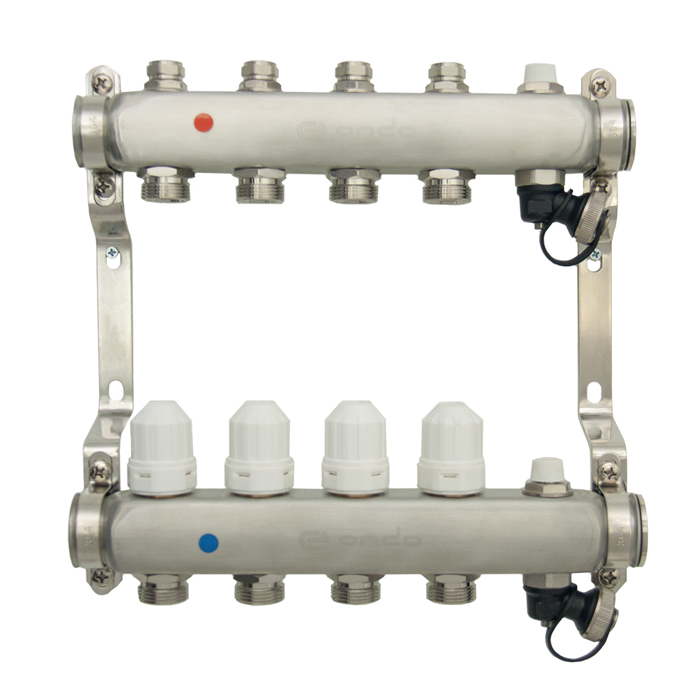 Коллекторная группа ONDO из нержавеющей стали предназначена для оптимизации, контроля и распределения теплоносителя в системах радиаторного и напольного отопления. Коллекторная группа — важный элемент водяного теплого пола. Благодаря ей происходит смешивание горячей и холодной жидкости. Такая особенность позволяет произвести регулировку температуры теплого пола и контролировать его работу. Коллекторная группа ONDO может работать на водяном, либо этиленгликолевом теплоносителе с максимальным содержанием гликоля не более 45%. Коллекторная группа поставляется предварительно в собранном виде. Воздухоотводчик и дренажный кран встроены в корпус. Материал корпуса — нержавеющая сталь. Установочные кронштейны входят в комплект. Насосно-смесительный узел приобретается отдельно. Данная модификация построена на использовании термостатических и запорных клапанов. Детали коллекторной группы соединены между собой на заводе с помощью уплотнительных колец и герметизированы специальным анаэробным клеем. Это позволяет отказаться от дополнительных герметизирующих и уплотнительных материалов при установке. Изделие соответствует требованиям ГОСТ 12.2.063–2015.
