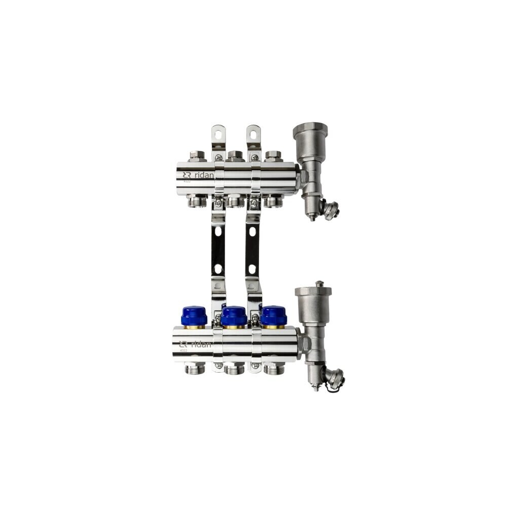 Комплектация: Подающий коллектор с запорными клапанами — 1 шт., обратный коллектор с клапанными вставками — 1 шт., торцевая секция с автоматическим воздухоотводчиком и сливным краном — 2 шт., кронштейны, инструкция на русском языке — 1 шт.