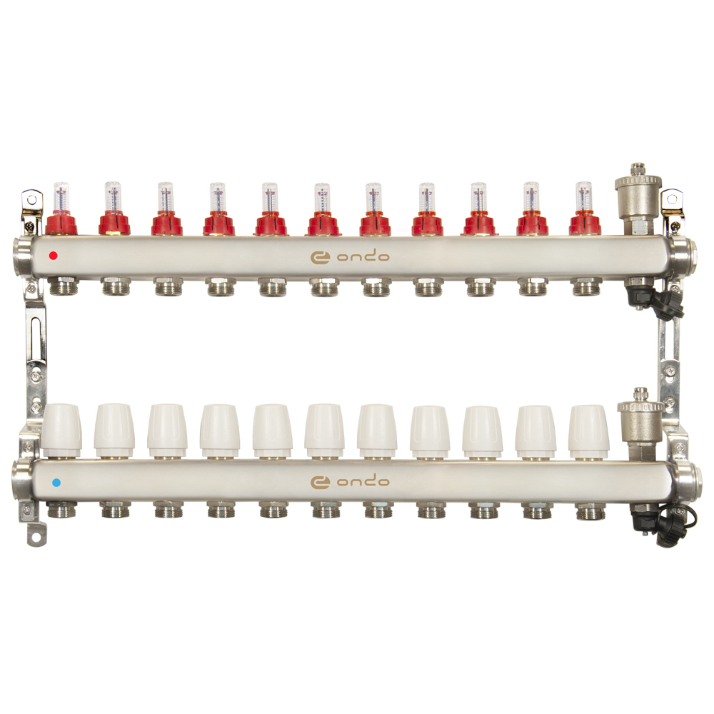 Коллекторная группа ONDO из нержавеющей стали предназначена для оптимизации, контроля и распределения теплоносителя в системах радиаторного и напольного отопления. Коллекторная группа — важный элемент водяного теплого пола. Благодаря ей происходит смешивание горячей и холодной жидкости. Такая особенность позволяет произвести регулировку температуры теплого пола и контролировать его работу. Коллекторная группа ONDO может работать на водяном, либо этиленгликолевом теплоносителе с максимальным содержанием гликоля не более 45%. Коллекторная группа поставляется предварительно в собранном виде. Автоматический воздухоотводчик и дренажный кран встроены в корпус. Материал корпуса — нержавеющая сталь. Установочные кронштейны входят в комплект. Насосно-смесительный узел приобретается отдельно. Данная модификация построена на использовании расходомеров и термостатических клапанов. Детали коллекторной группы соединены между собой на заводе с помощью уплотнительных колец и герметизированы специальным анаэробным клеем. Это позволяет отказаться от дополнительных герметизирующих и уплотнительных материалов при установке. Изделие соответствует требованиям ГОСТ 12.2.063–2015.