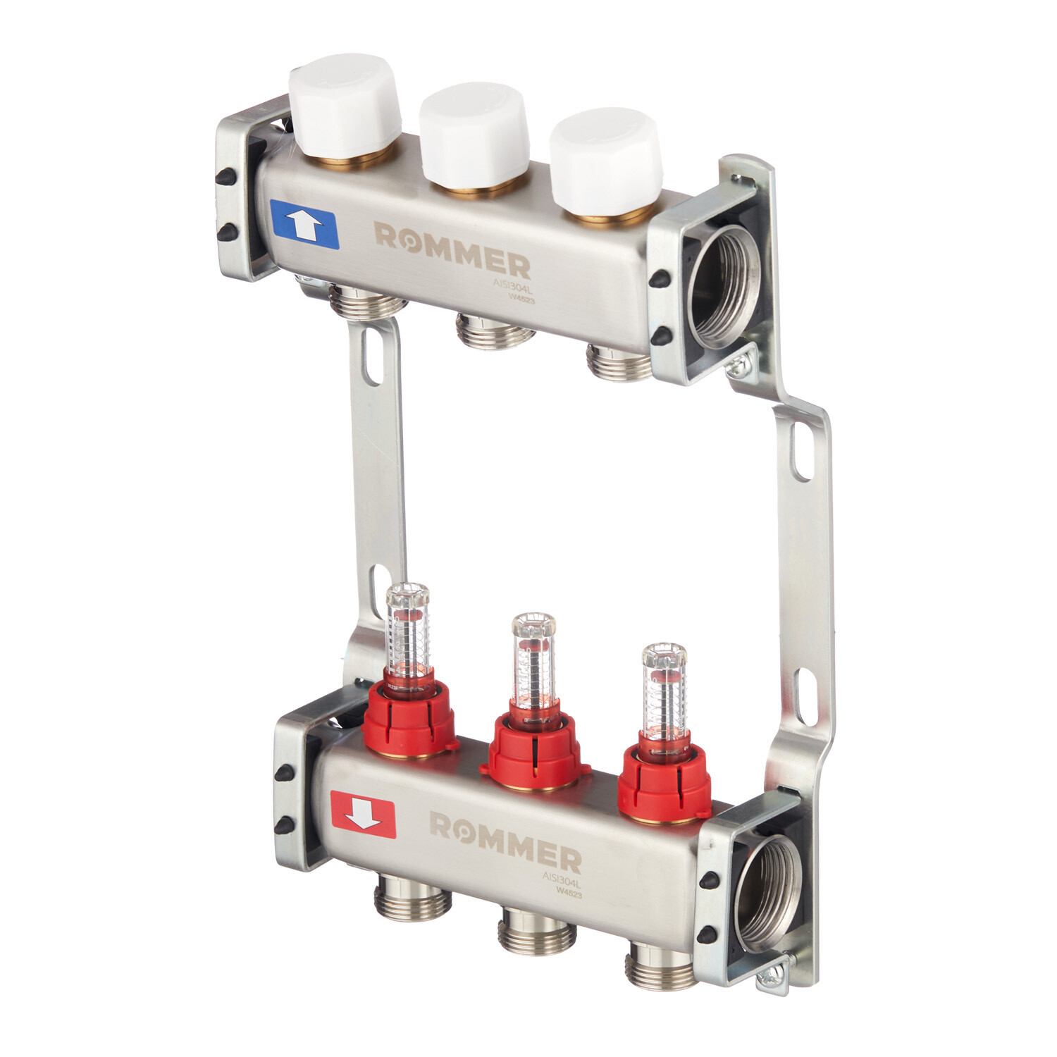 Коллекторная группа Rommer предназначена для распределения потоков теплоносителя в системах водяных теплых полов, либо системах радиаторного отопления. Состоит из подающего коллектора с ручными регулировочными клапанами с расходомерами и обратного коллектора с ручными запорными клапанами, на которые можно установить электротермические сервоприводы. Термостатические клапаны предназначены для изменения температуры отдельно в каждом контуре системы. Расходомеры обеспечивают равномерную циркуляцию теплоносителя по всей системе.