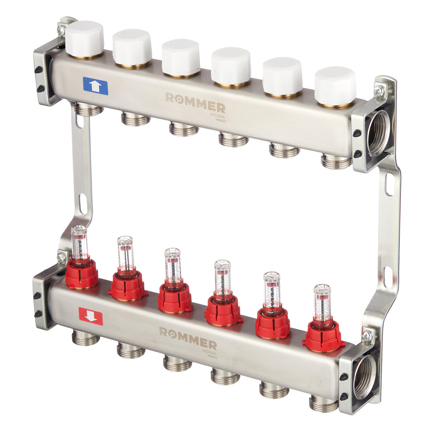 Коллекторная группа Rommer предназначена для распределения потоков теплоносителя в системах водяных теплых полов, либо системах радиаторного отопления. Состоит из подающего коллектора с ручными регулировочными клапанами с расходомерами и обратного коллектора с ручными запорными клапанами, на которые можно установить электротермические сервоприводы. Термостатические клапаны предназначены для изменения температуры отдельно в каждом контуре системы. Расходомеры обеспечивают равномерную циркуляцию теплоносителя по всей системе.