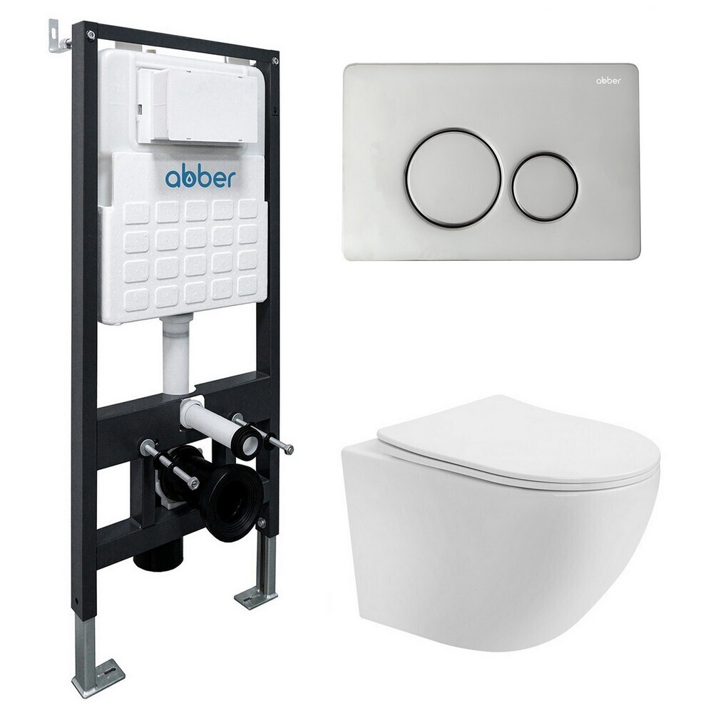 Комплект Abber 3 в 1. В комплекте есть все необходимое для быстрого монтажа. Состоит из подвесного керамического унитаза со смывом торнадо, сиденья для унитаза из дюропласта с микролифтом, инсталляции AC0105, кнопки смыва из нержавеющей стали.