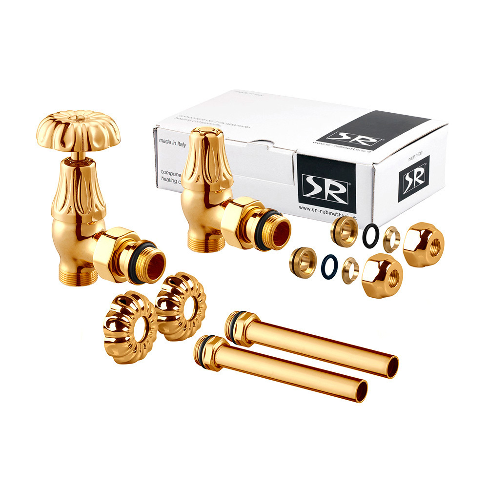Комплект угловых вентилей SR Rubinetterie серия Floral Old Style, соединения для медных и многослойных труб. Трубки, изготовленные из латуни, имеют декоративные отражатели, которые по дизайну сочетаются с клапанами радиатора.