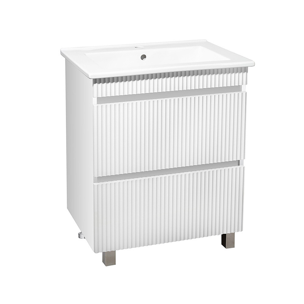 Тумба с раковиной Runo Модена 660 мм напольная белая (00-00001452) – это изысканность и утонченная роскошь в интерьере. Волнистые рифленые фасады визуально «оживляют» и «приводят в движение» всю обстановку комнаты, сохраняя при этом умиротворение и покой, превосходно сочетаются с классическим белым цветом корпуса. Цвет фасада также классический – белый глянец, идеально впишется в любой интерьер ванной комнаты. Тумба для ванной оснащена двумя выдвижными ящиками на шариковых направляющих.
