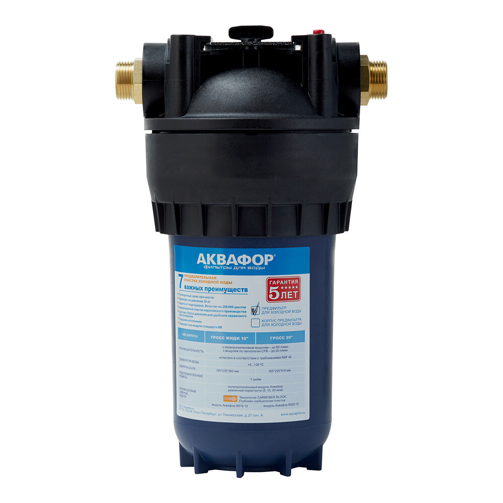 Предназначен для предварительной очистки холодной воды от механических примесей (песка, ржавчины и т.п.). В зависимости от типа используемого фильтрующего элемента, предфильтр очищает воду от примесей разного размера. Использование предфильтра облегчает работу фильтра для питьевой воды, а также защищает бытовую технику (стиральные и посудомоечные машины, водонагреватели) от поломок.