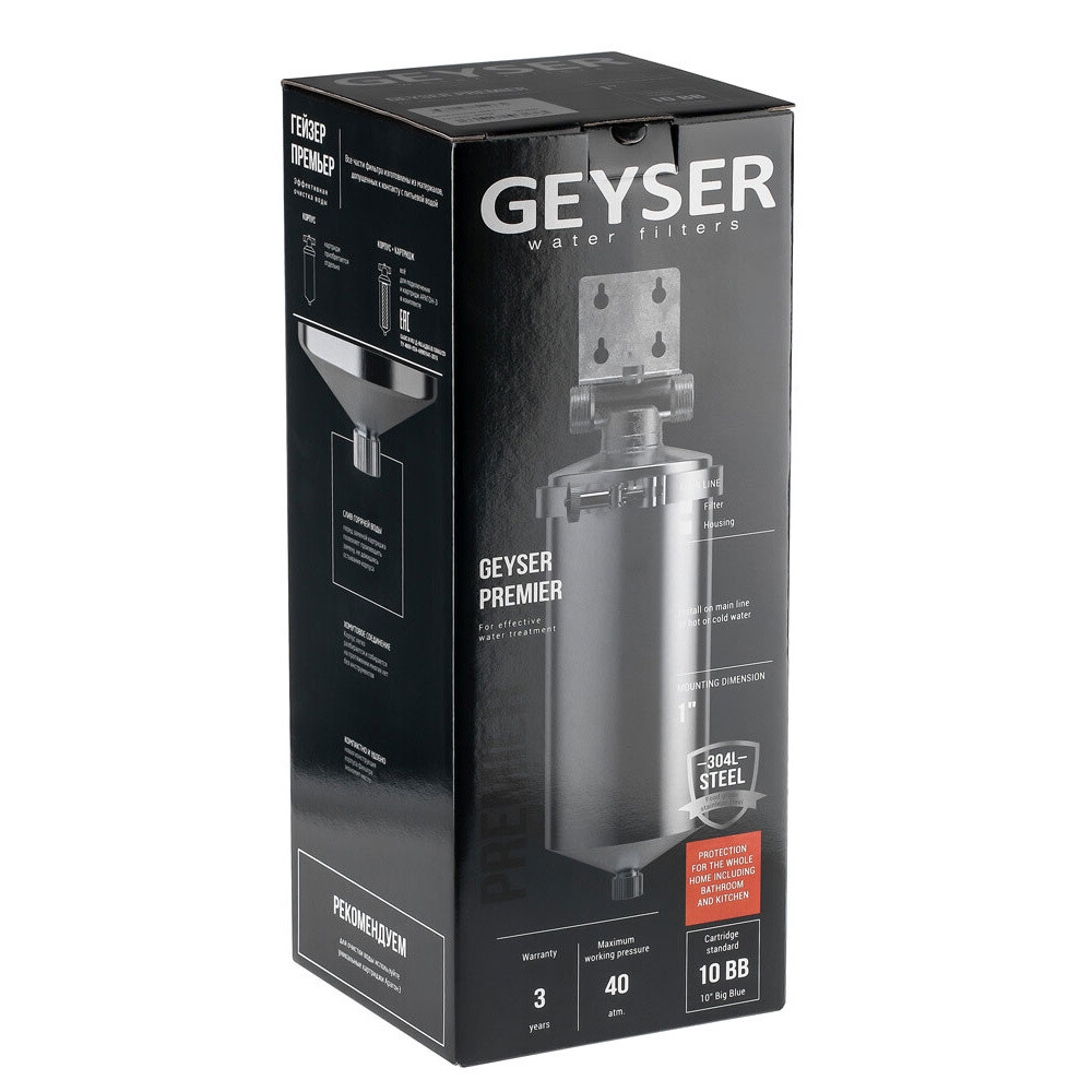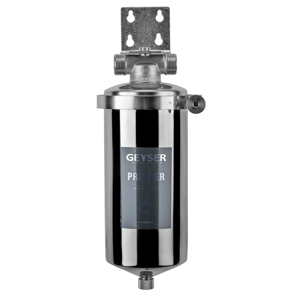 Гейзер Премьер 10BB 1″ устанавливается на вход в систему горячего или холодного водоснабжения. Корпус фильтра изготовлен из высококачественной нержавеющей стали марки 304L, устойчивой к возникновению коррозии, что гарантирует высокую надежность и многолетнюю работу фильтра.