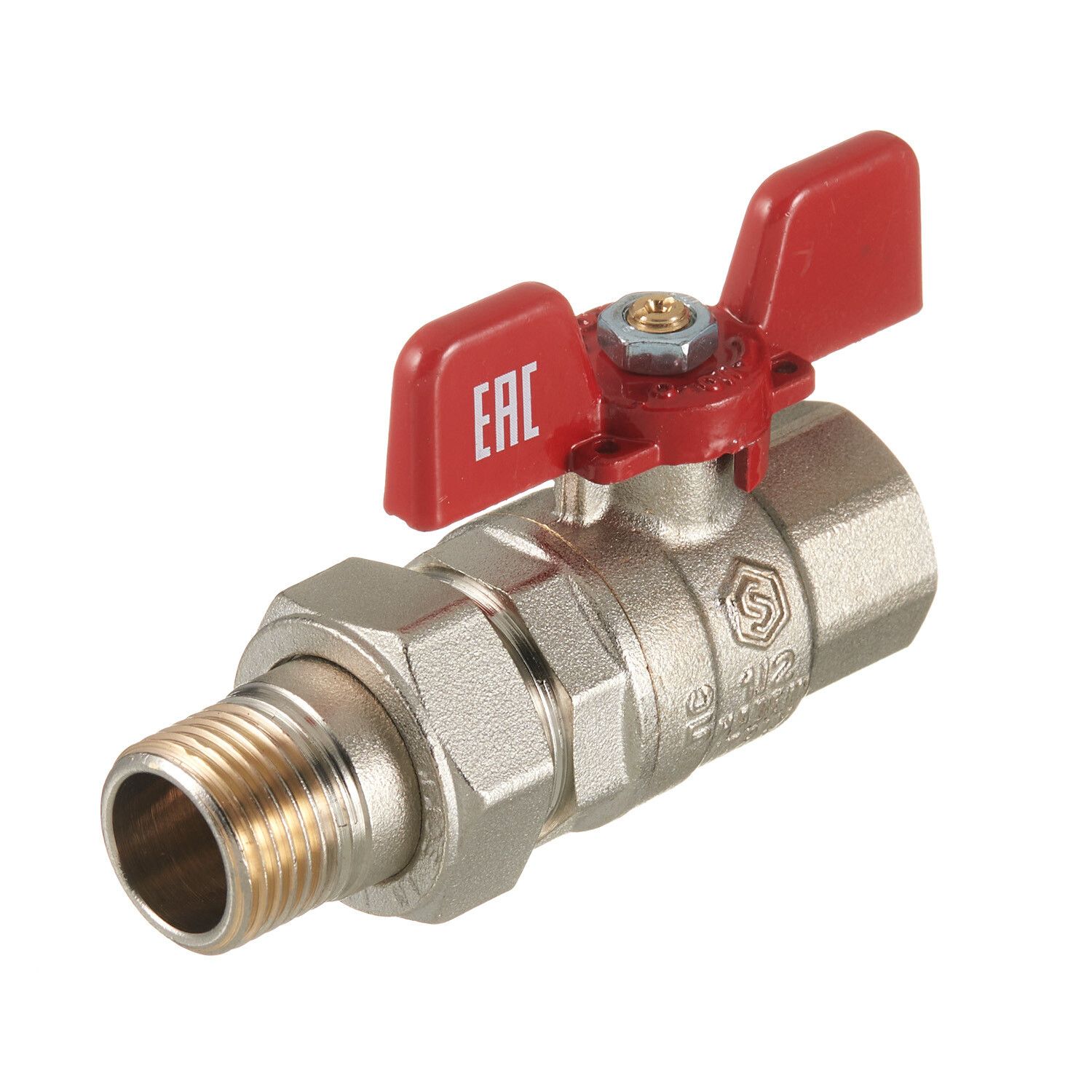 Кран шаровой латунный Stout SVB 1/2 ВР(г) х 1/2 НР(ш) полнопроходной бабочка со сгоном прямой (SVB-1007-200015)