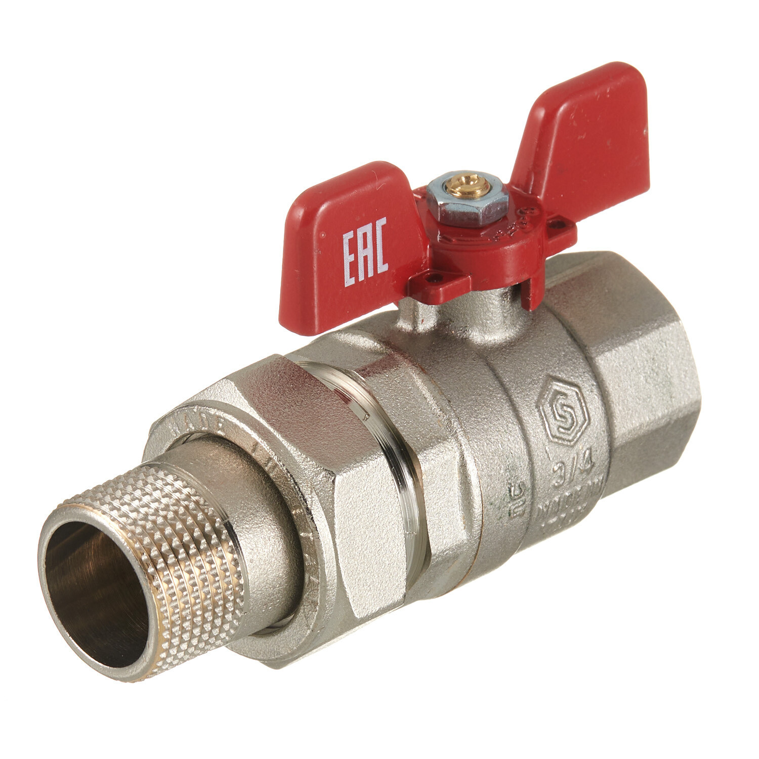 Кран шаровой латунный Stout SVB 3/4 ВР(г) х 3/4 НР(ш) полнопроходной бабочка со сгоном прямой (SVB-1007-200020)