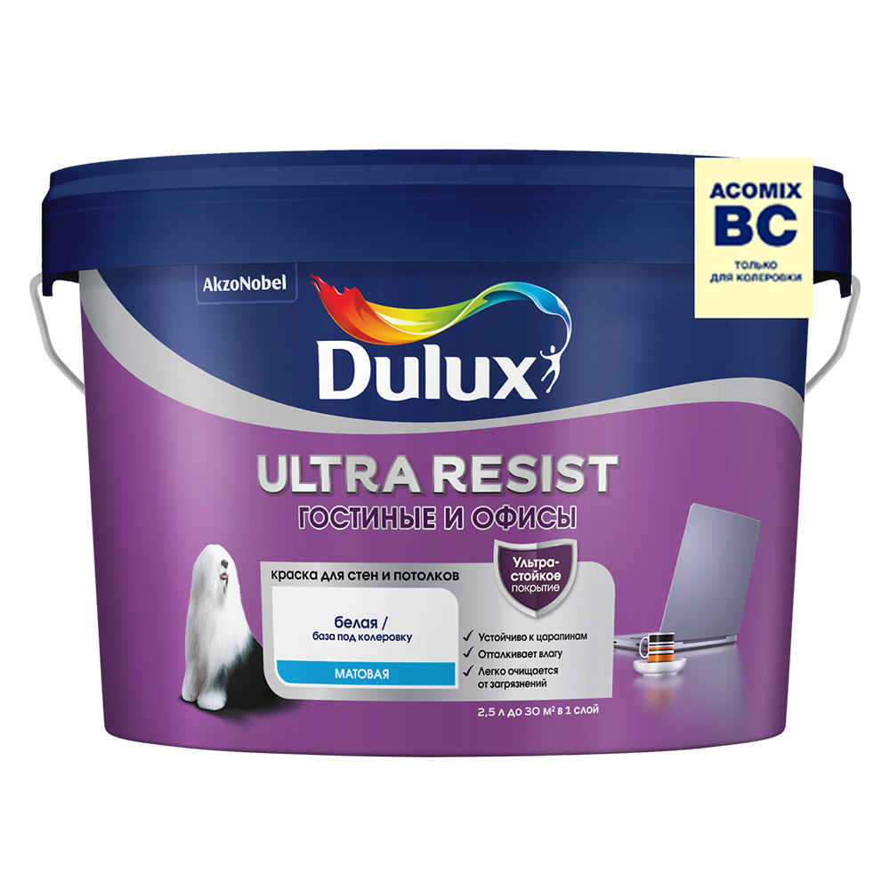 Краска моющаяся Dulux/Luxium Ultra Resist гостиные и офисы база BС бесцветная 2,5 л