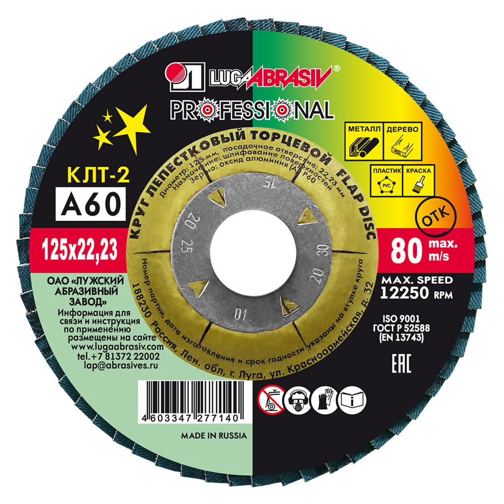 Круг лепестковый по металлу/древесине Луга Professional 125х22,2 мм P60 торцевой