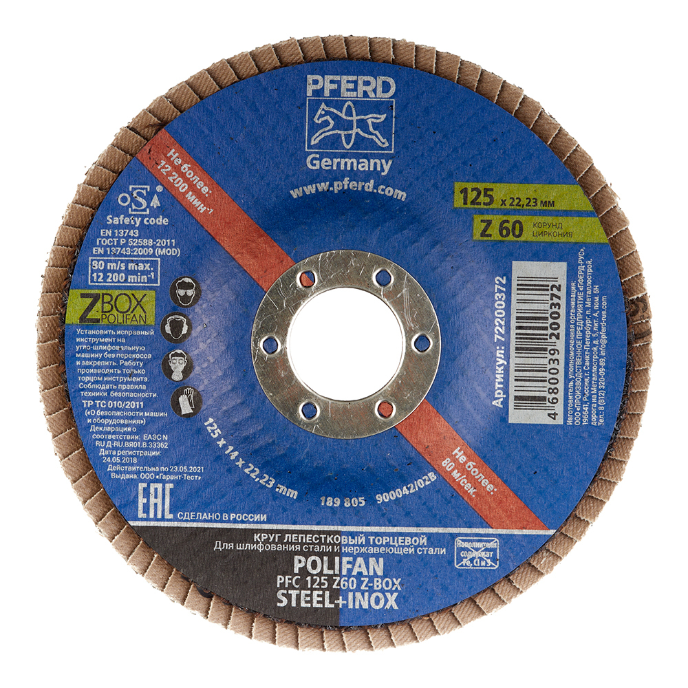 Круг лепестковый по нержавеющей стали Pferd Z-BOX 125×22 мм P60 торцевой (72200372)